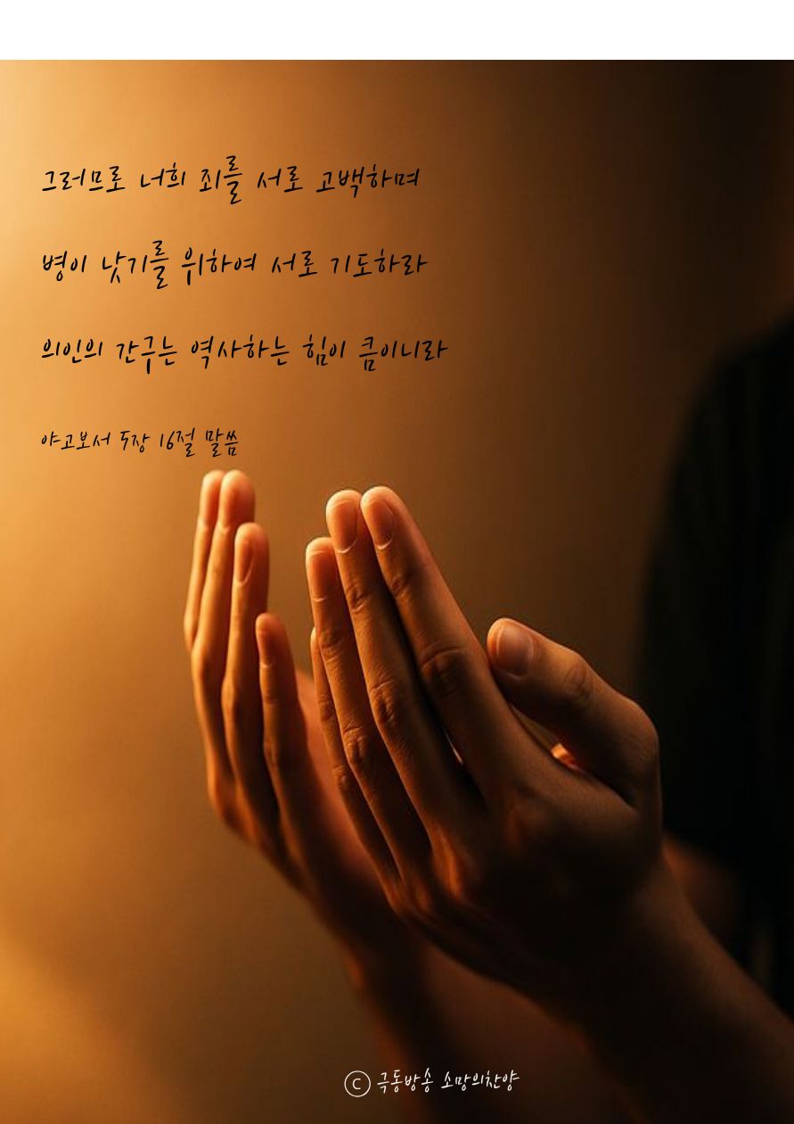 그러므로 너희 죄를 서로 고백하며 병이 낫기를 위하여 서로 기도하라 의인의 간구는 역사하는 힘이 큼이니라