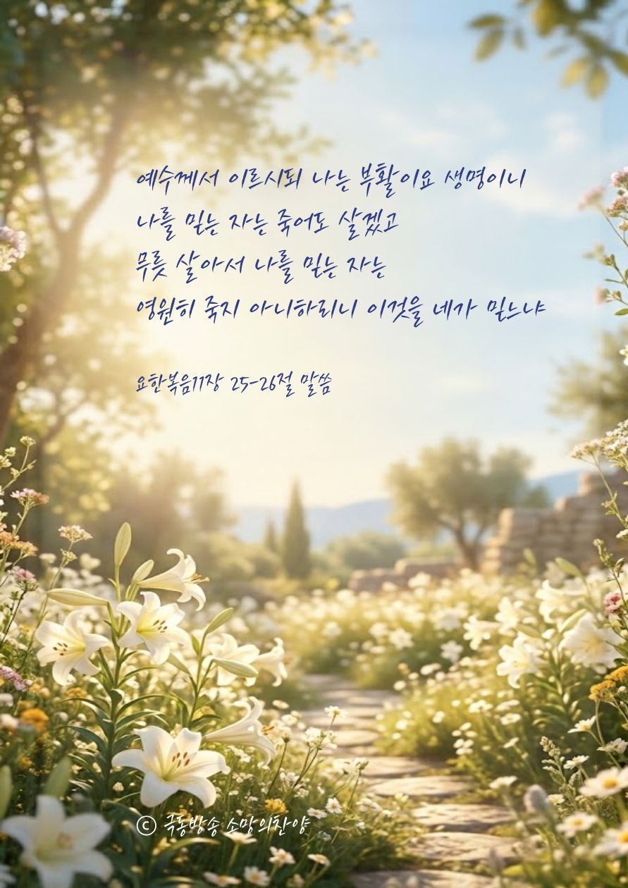 "예수께서 이르시되 나는 부활이요 생명이니 나를 믿는 자는 죽어도 살겠고
