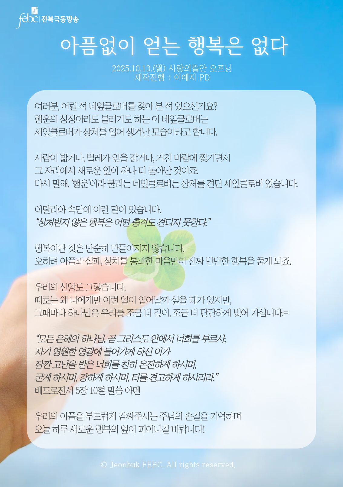 [전북] 25.10.13.(월) 사랑의뜰안 오프닝 "아픔없이 얻는 행복은 없다"